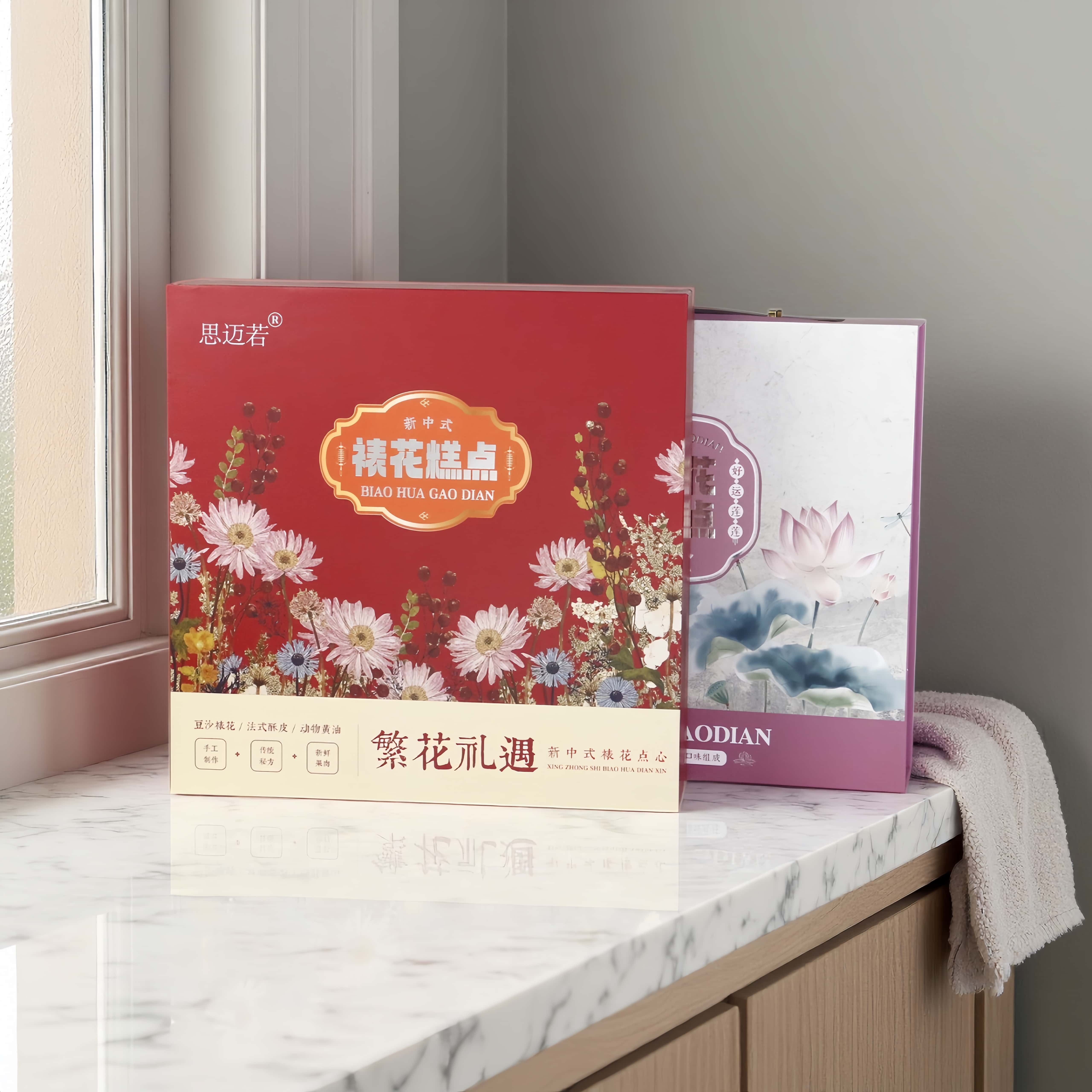 印刷采用五色胶印+局部UV工艺,花朵、荷花等核心图案做UV提亮,触感凹凸有层次,远看有光泽感,比满版烫金成本降低40%,视觉效果足够亮眼。盒型采用一体式翻盖礼盒结构,模切精度控制在±0.5mm,折叠后缝隙均匀;裱纸采用250g铜版纸覆哑膜,搭配1200g灰板内芯,拿在手里有足够分量感,同时比实木盒、特种纸礼盒成本更低。生产环节通过自动化糊盒机批量生产,配合人工质检核对色差、裱糊平整度,良品率控制在98%以上,兼顾规模化生产的效率与品质稳定性。