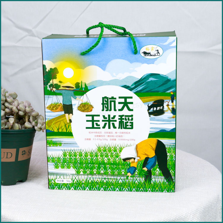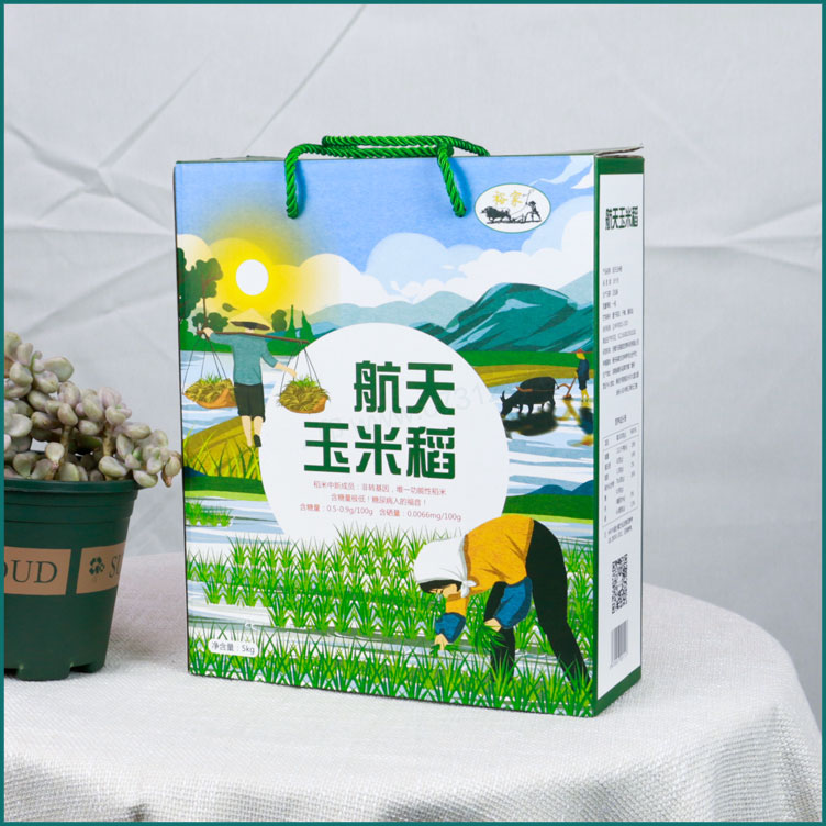 【使用范围】:航天玉米稻大米包装盒材质广泛适用于农产品包装盒,水果包装盒,腊鱼/腊肉包装盒,特产包装盒,活鸡/鸡蛋包装盒等,长沙大米包装盒生产厂家,提供免费设计/打样,送货上门。