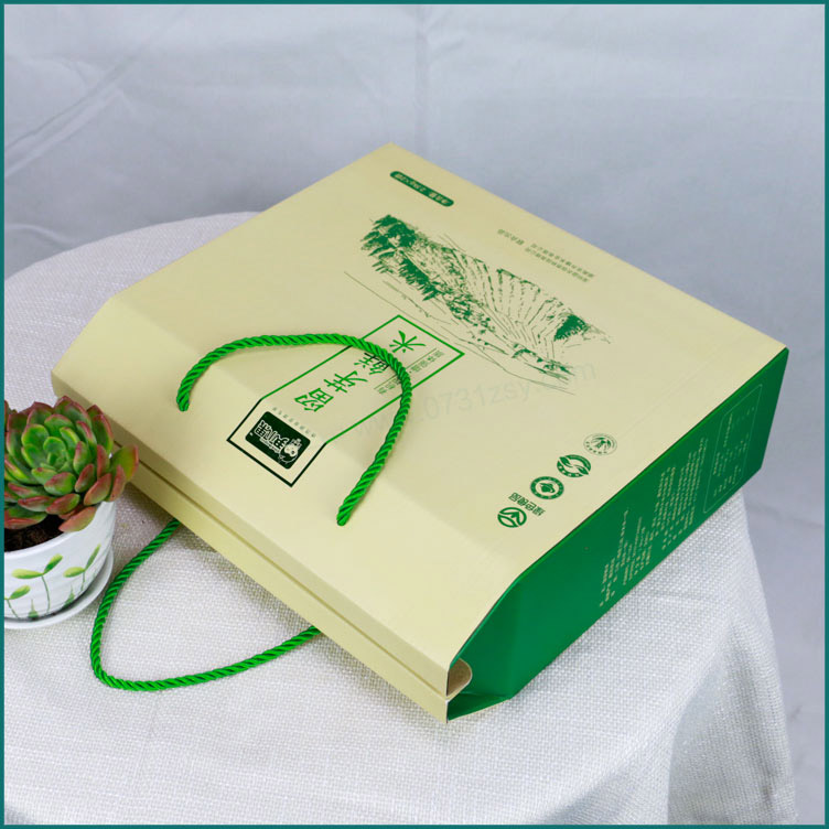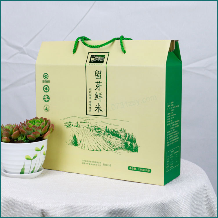 乌山贡米包装盒材质为白卡纸裱瓦楞,是一款常见的提手盒,由长沙包装盒厂厂家生产制作,用于装5kg大米,盒子整体牢固承重强,用白卡纸裱瓦楞也不会现瓦楞,非常精致美观,广泛适用于农产品包装,水果包装礼盒,土特产包装盒,腊鱼腊肉包装盒等纸质包装材料种类