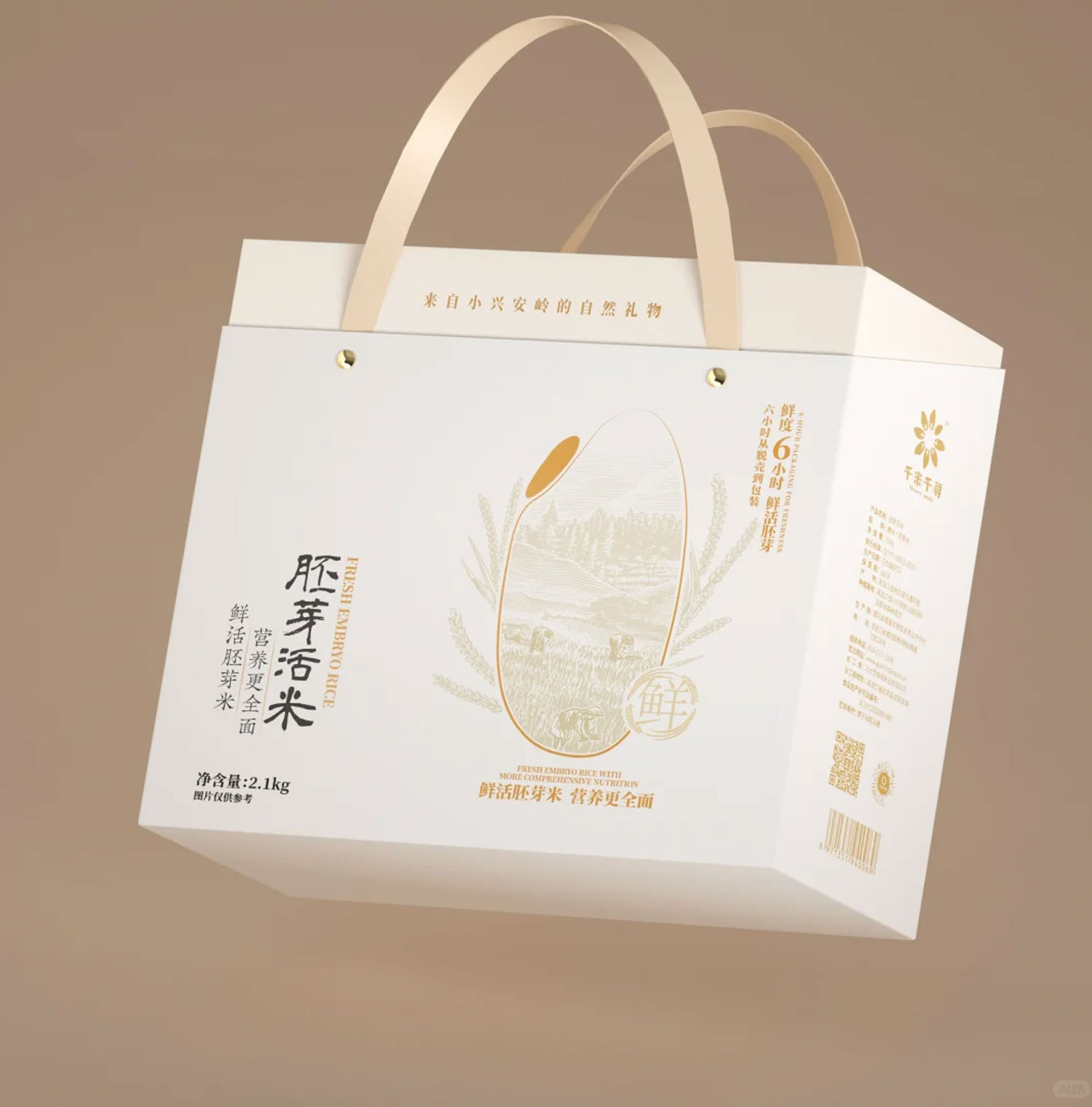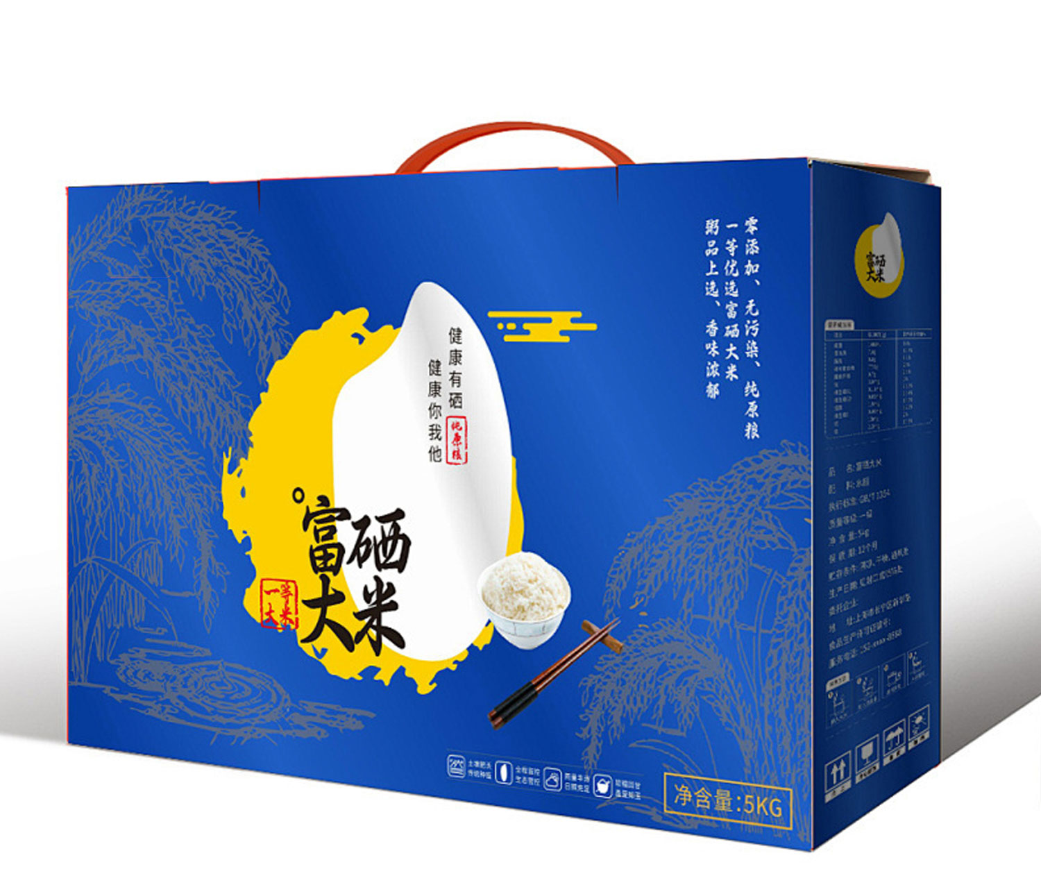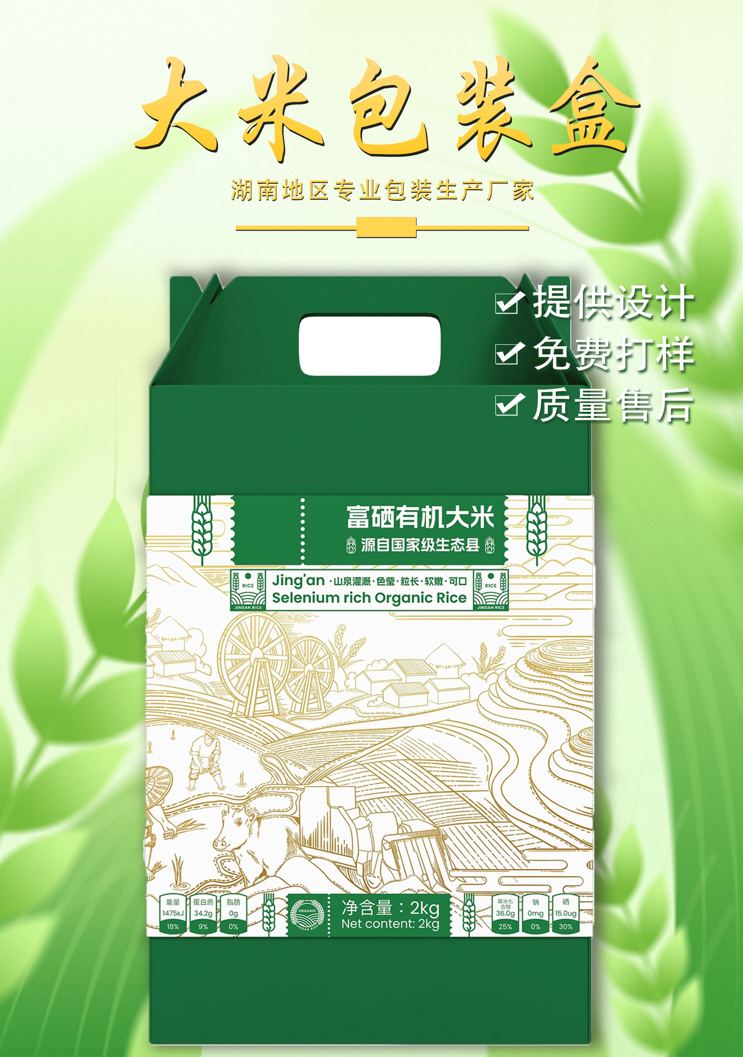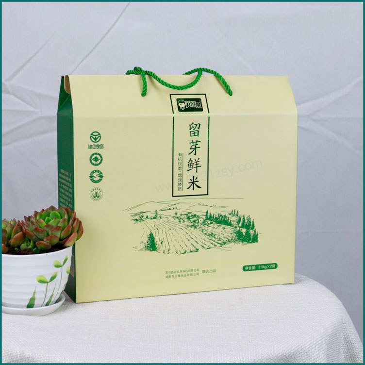 【使用范围】:留芽鲜米包装盒材质为白板纸裱瓦楞,是一款手提斜面双插盒,广泛适用于农产品包装,水果包装礼盒,土特产包装盒,腊鱼腊肉包装盒等