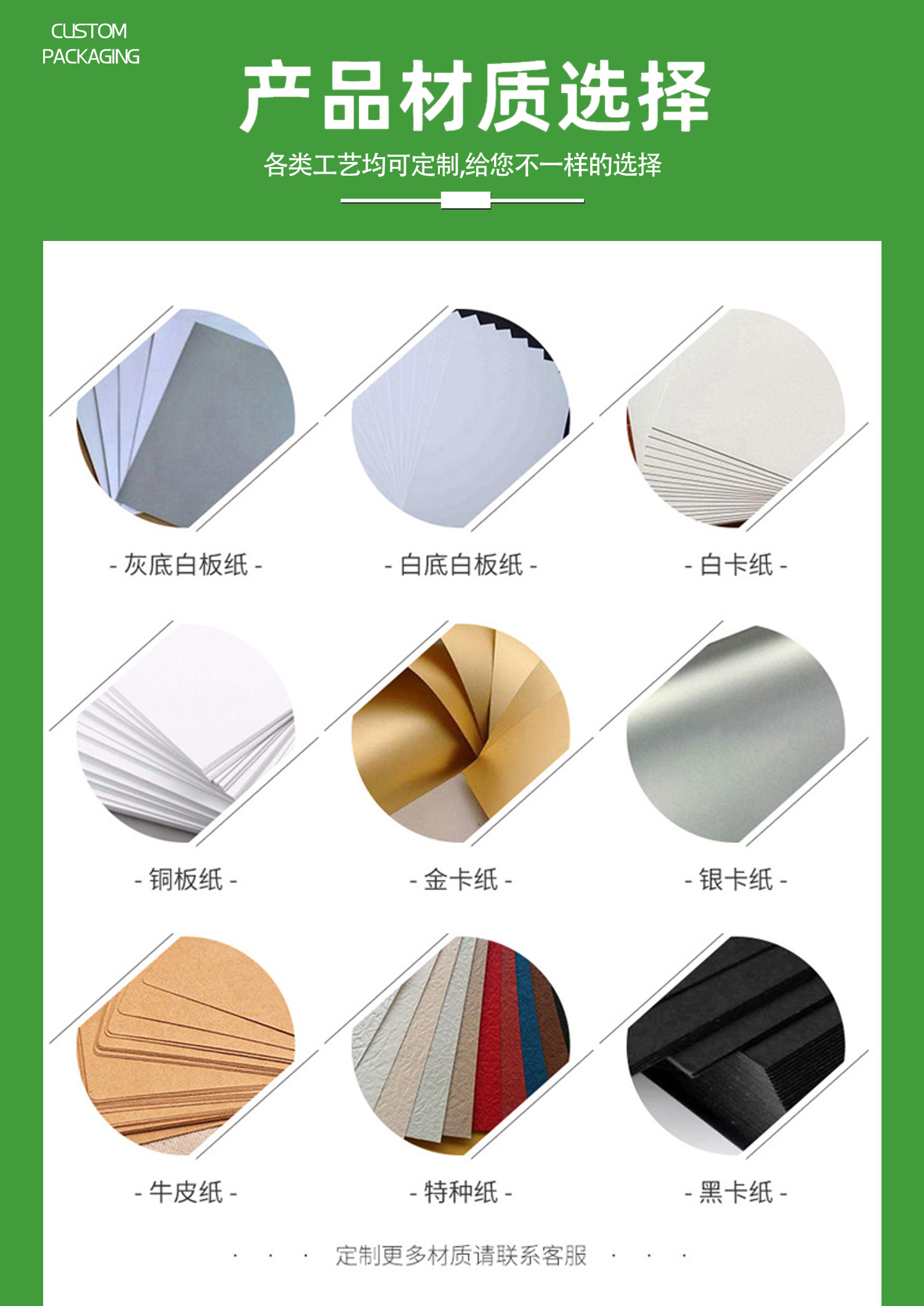 具有特殊纹理、质感或功能的纸张,如压纹纸、硫酸纸、金属箔纸等,提升包装档次。