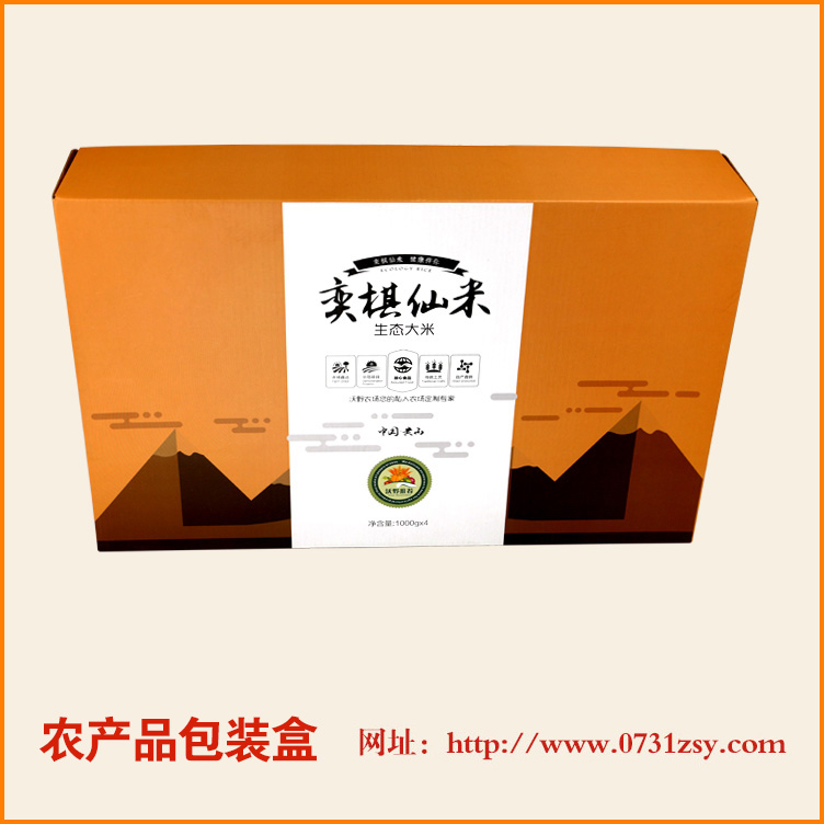 乌山贡米包装盒材质为白卡纸裱瓦楞,是一款常见的提手盒,由长沙包装盒厂厂家生产制作,用于装5kg大米,盒子整体牢固承重强,用白卡纸裱瓦楞也不会现瓦楞,非常精致美观,广泛适用于农产品包装,水果包装礼盒,土特产包装盒,腊鱼腊肉包装盒等