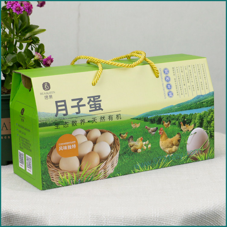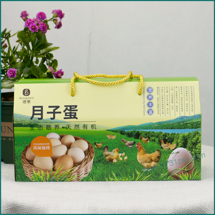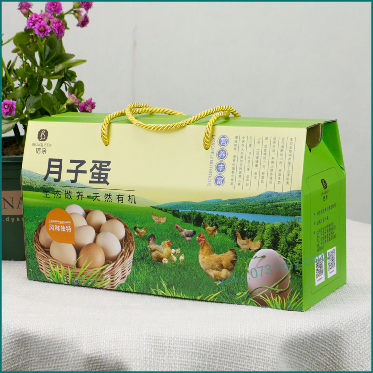 月子蛋鸡蛋盒定做材质为瓦楞纸,可承重5斤左右,盒型是提绳双插盒,广泛适用于土鸡蛋礼品包装盒,鸡蛋包装盒,特产包装盒,腊鱼腊肉包装盒等,长沙包装盒厂提供设计/定稿,2-3天出样,热线:177-6366-7656