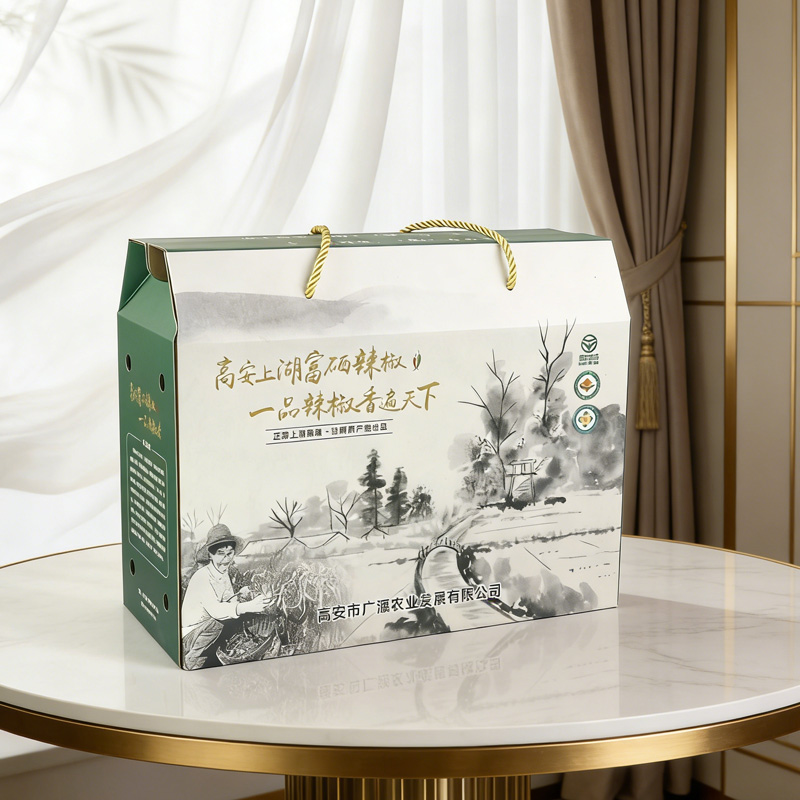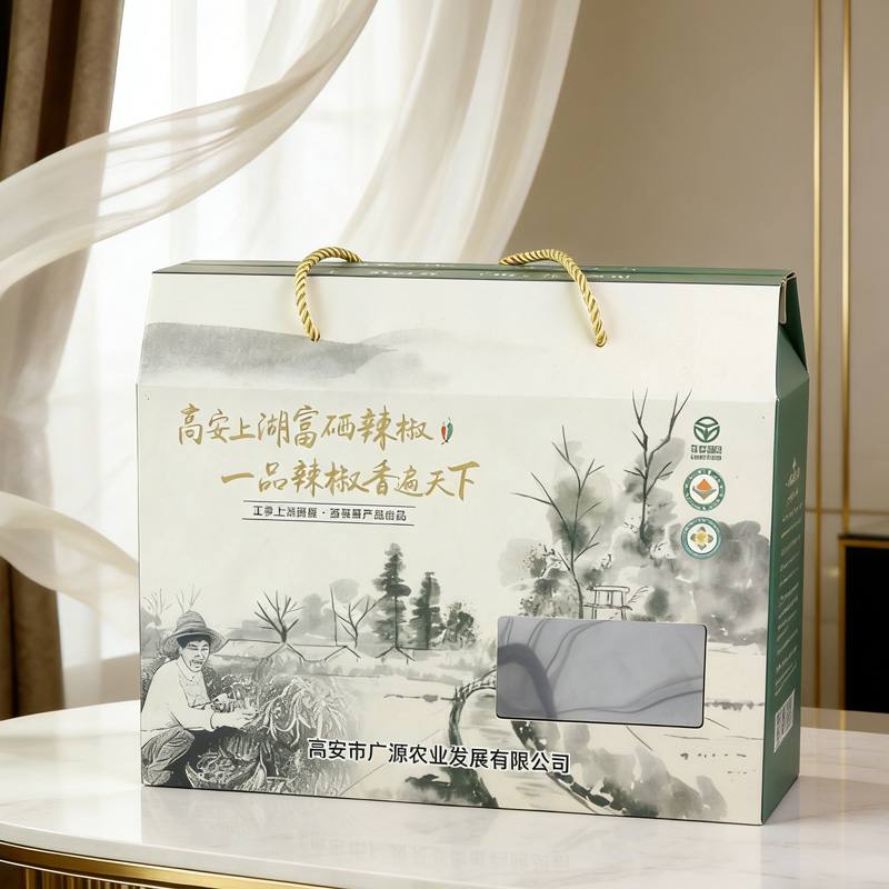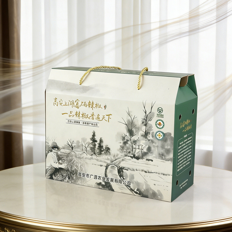 【使用范围】:此款辣椒包装礼盒,采用白卡纸印刷裱瓦楞纸,此款包装礼盒广泛应用于:茶叶包装盒,礼品包装、茶叶包装、茶油包装、特产包装、农产品包装等多个领域——湖南十方艺印包装
