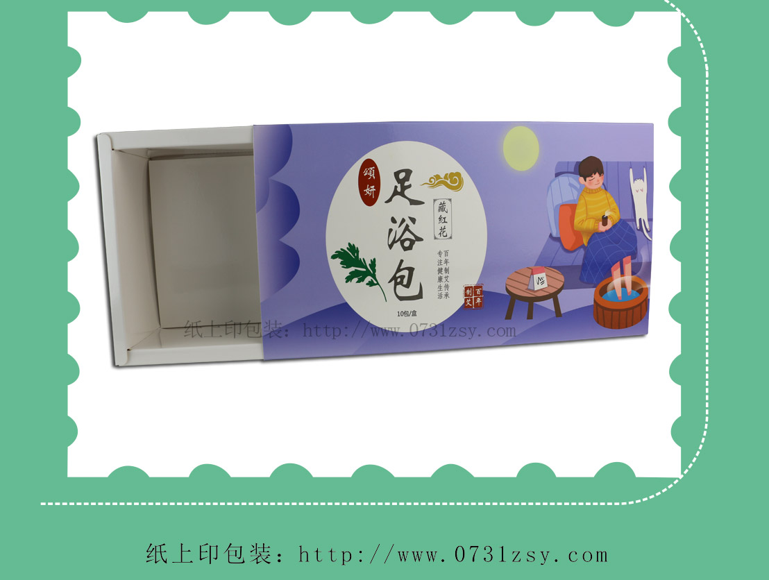 颂妍足浴包包装盒是长沙制作包装盒厂家十方艺印设计制作的一款包装卡盒,此款卡盒为一个抽屉盒,里面分别由3个小卡盒组合而成,卡通人物是由十方艺印的包装设计师菲菲手绘而成,搭配淡淡的紫色更能吸年轻的消费。