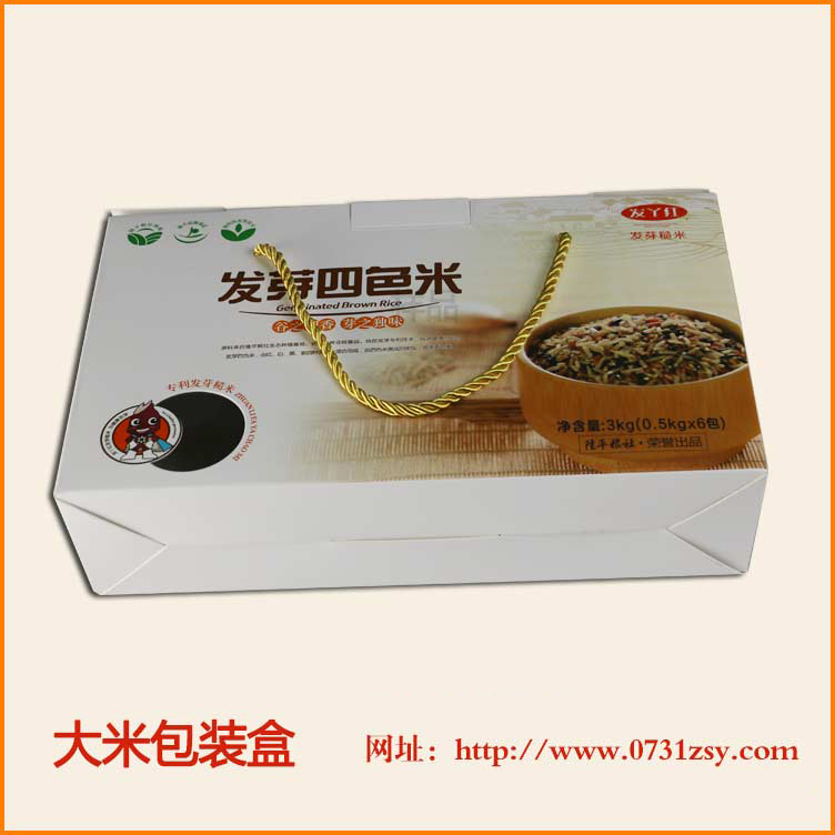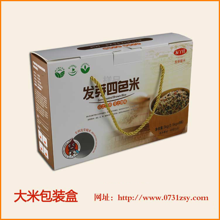 【使用范围】:发芽四色米包装盒材质广泛适用于农产品包装盒,腊鱼/腊肉包装盒,特产包装盒,产品包装盒,活鸡/鸡蛋包装盒等,长沙大米包装盒订做厂家,免费设计,1至2天定稿。