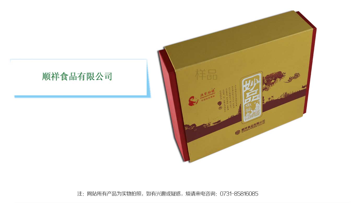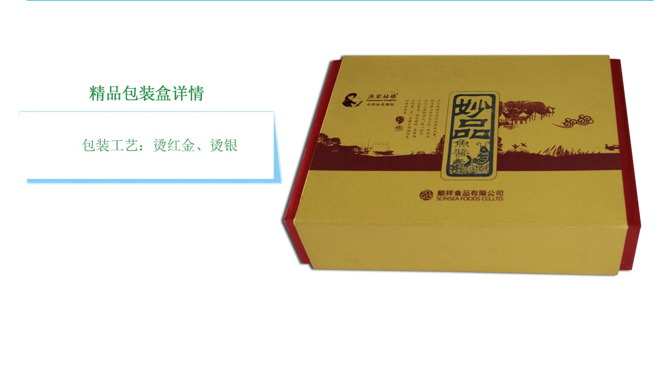 顺祥食品有限公司成立于2000年9月,坐落在湖南益阳市南县工业园,下辖湖南海怡生物科技股份有限公司、湖南渔家姑娘食品有限公司和湖南金水湾农业发展有限公司,是一家集水产养殖、食品加工、生物制药、国际贸易、科研开发于一体的综合型民营企业。此次与长沙精装盒制作公司十方艺印达成合作协议,长沙十方艺印包装设计制作这款精装盒为书型盒,选用特种纸并采用烫红金烫银等工艺制作而成,金色搭配红色两个颜色使盒子简洁大气,有颜值的精品包装盒更能助力产品销量!