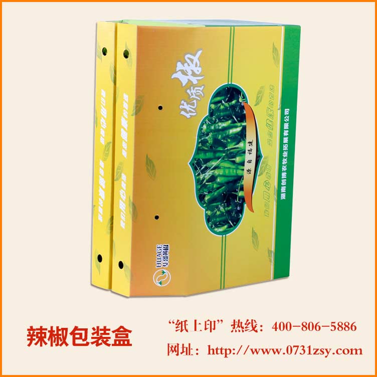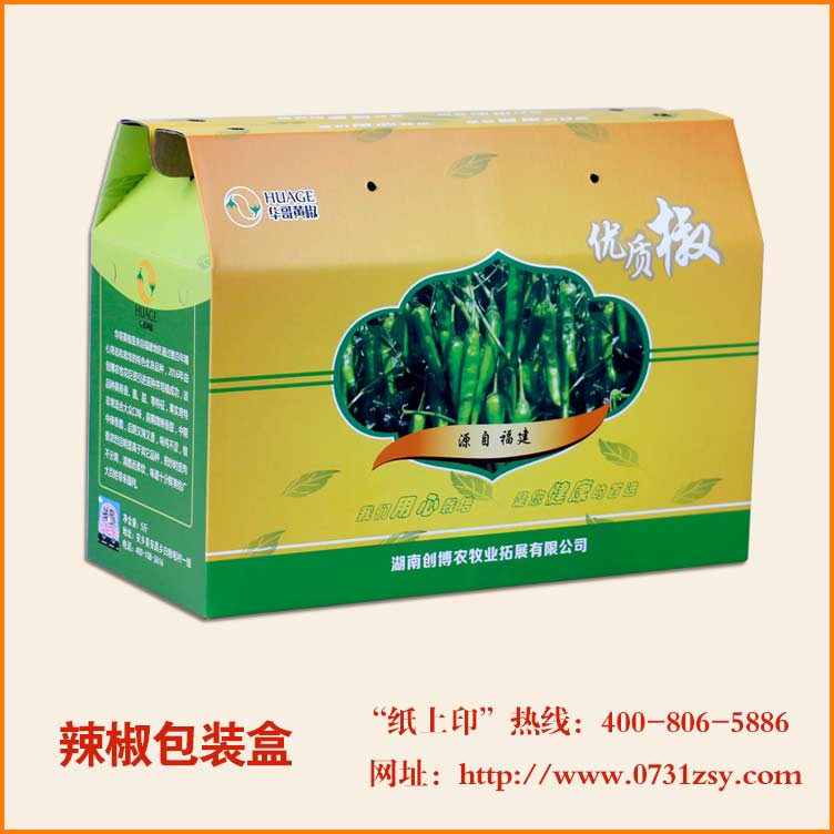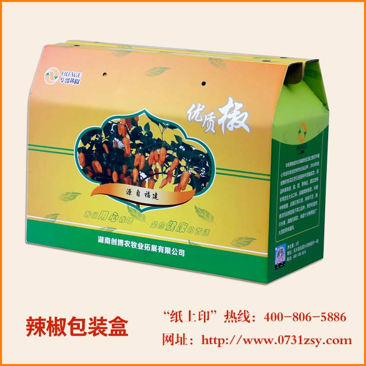 【使用范围】:此款辣椒包装盒采用白板纸裱瓦楞纸印刷,广泛适用于农副产品包装盒,食品包装礼盒,特产包装礼盒,水果包装礼盒等,长沙包装生产厂家,免费打样,设计制作一体化,热线:13317315099