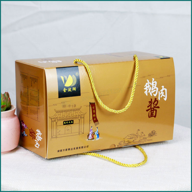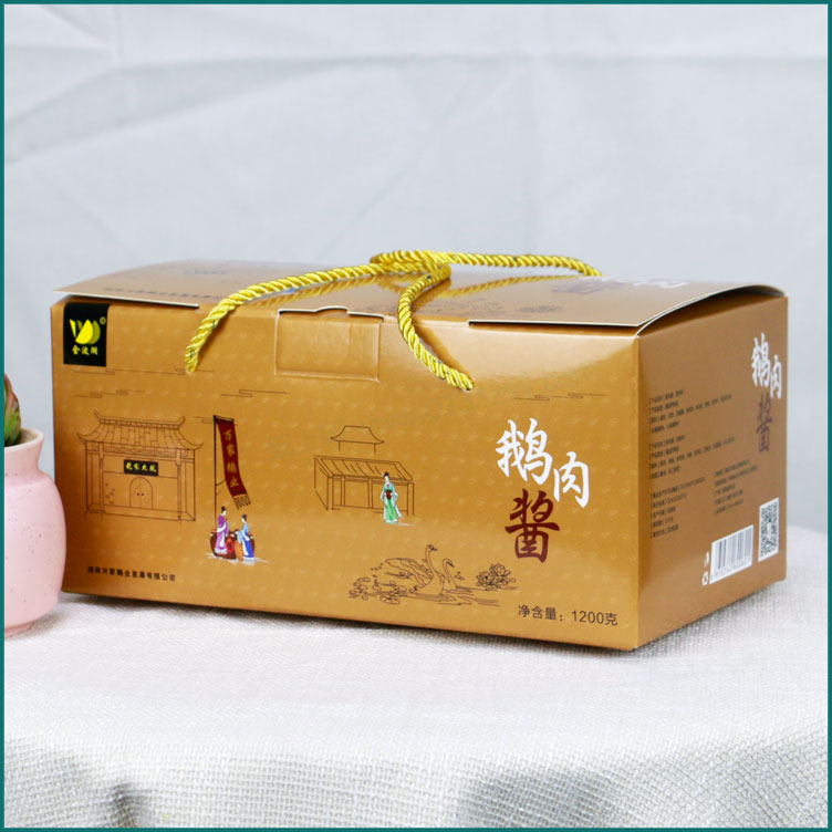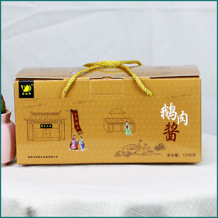【使用范围】:湖南万家鹅业鹅肉酱包装盒材质为白卡纸对裱,此款白卡纸包装盒广泛使用于:食品包装盒,蜂蜜包装盒,茶油包装礼盒等领域