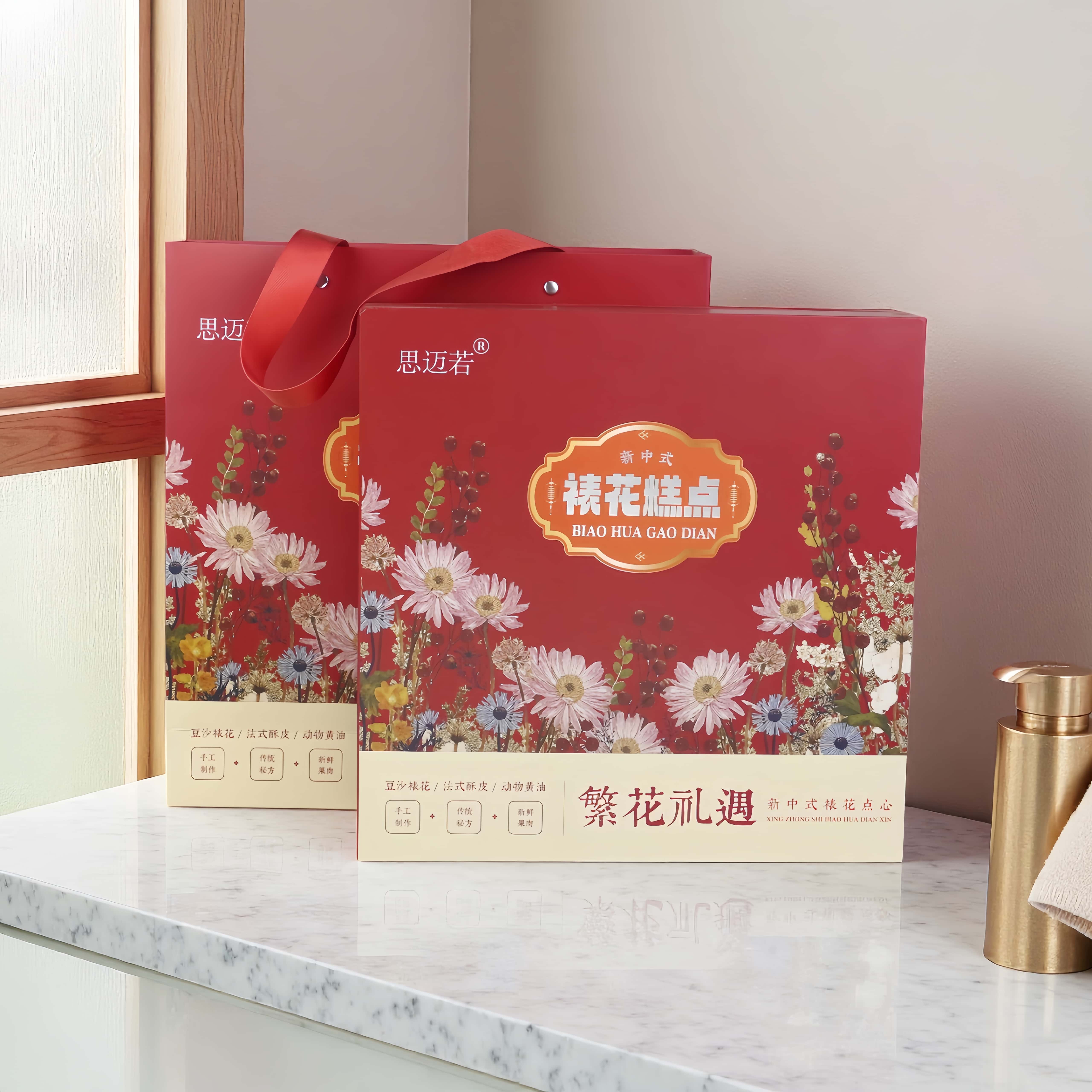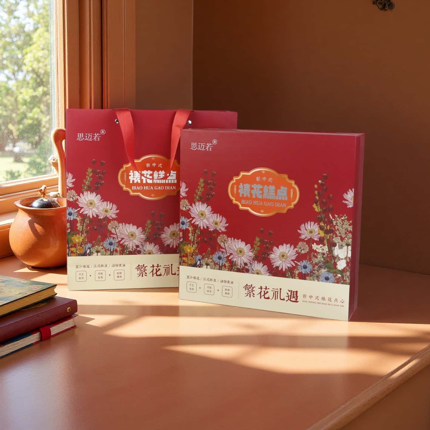 印刷采用五色胶印+局部UV工艺,花朵、荷花等核心图案做UV提亮,触感凹凸有层次,远看有光泽感,比满版烫金成本降低40%,视觉效果足够亮眼。盒型采用一体式翻盖礼盒结构,模切精度控制在±0.5mm,折叠后缝隙均匀;裱纸采用250g铜版纸覆哑膜,搭配1200g灰板内芯,拿在手里有足够分量感,同时比实木盒、特种纸礼盒成本更低。生产环节通过自动化糊盒机批量生产,配合人工质检核对色差、裱糊平整度,良品率控制在98%以上,兼顾规模化生产的效率与品质稳定性。