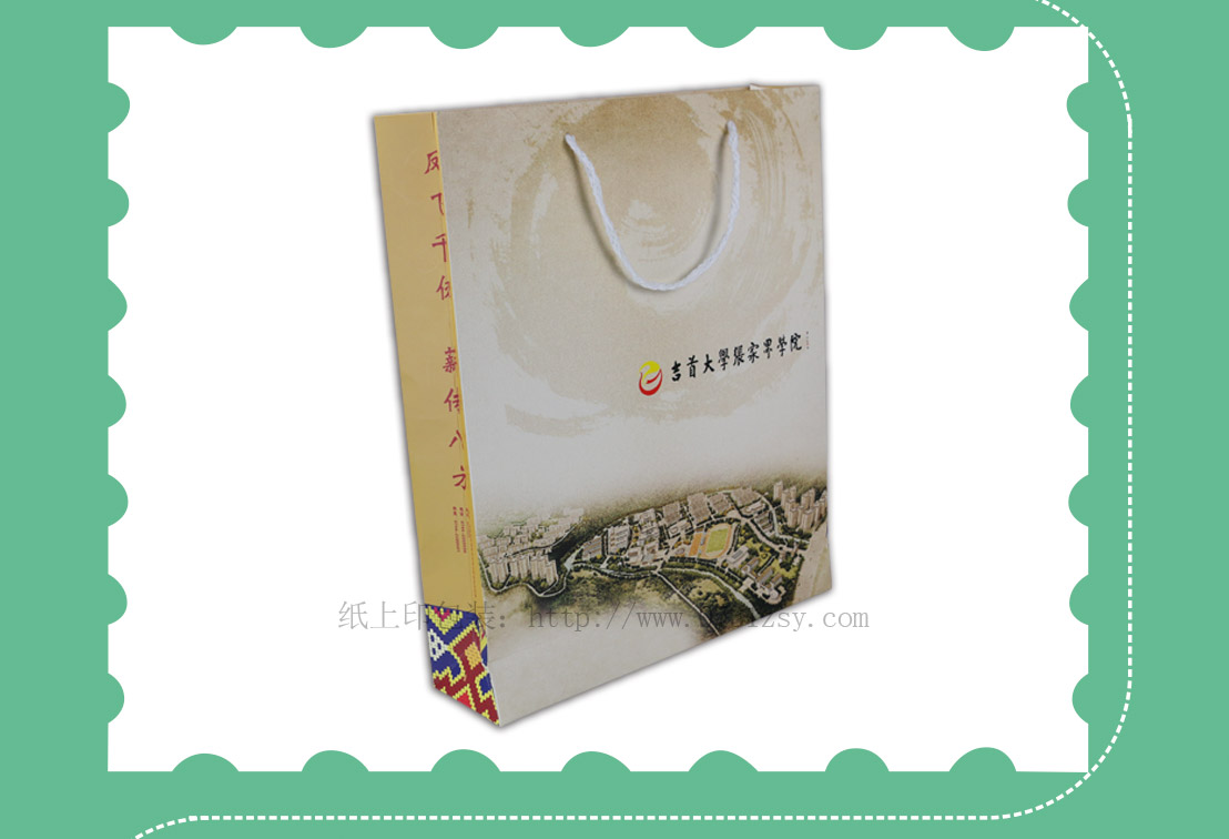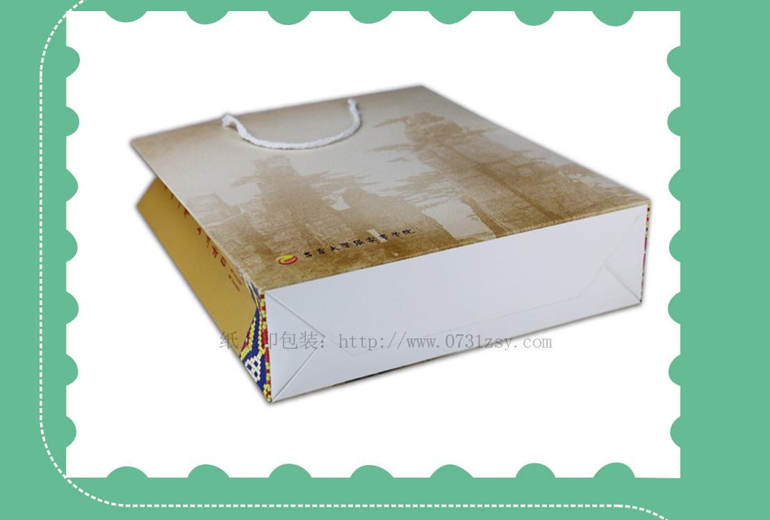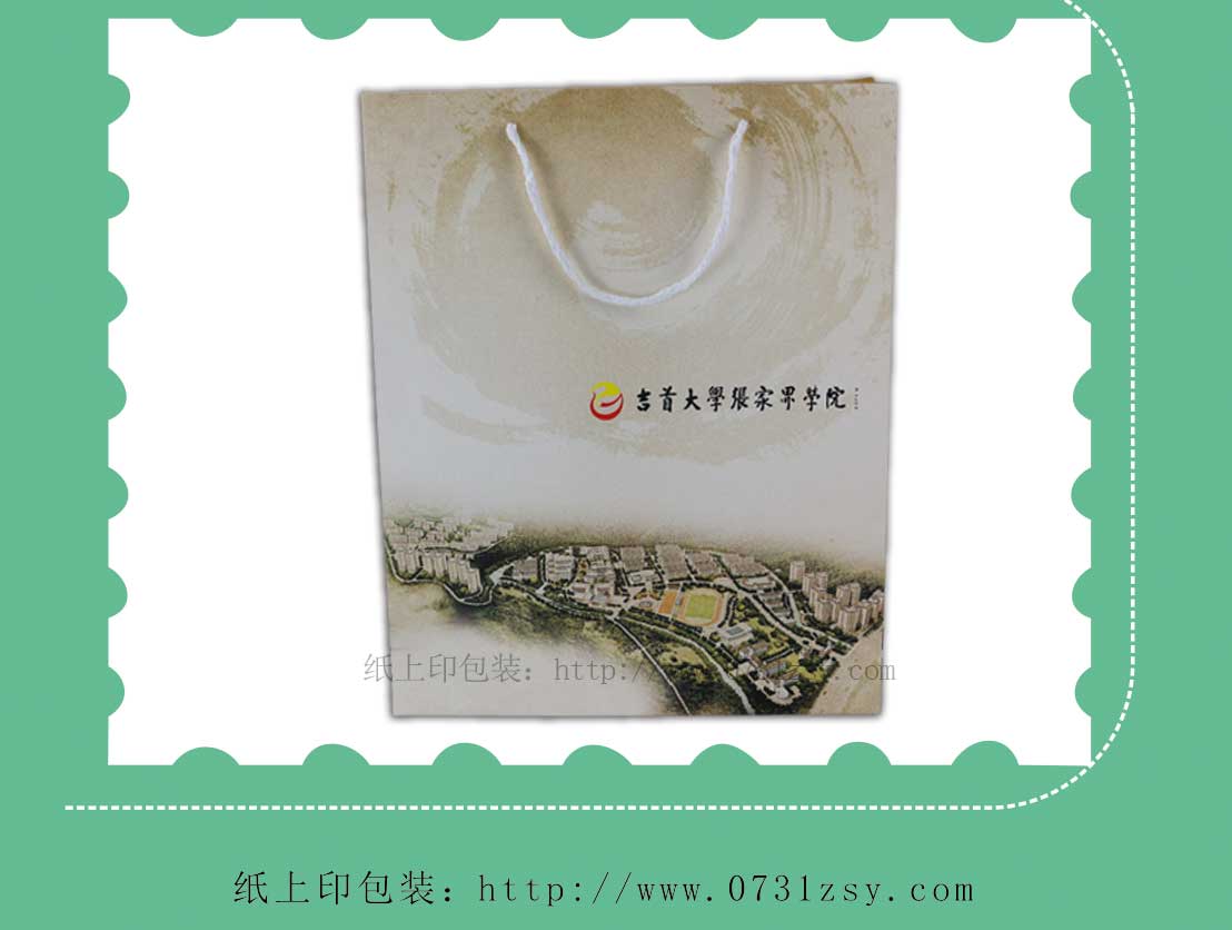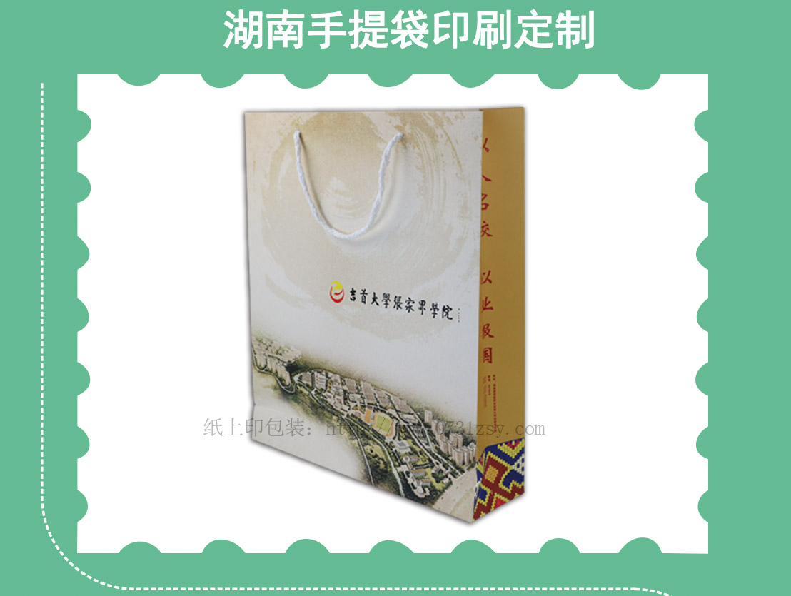 此款手提袋设计印刷采用250克白卡纸印刷,选用棉绳制作而成,手提袋设计简洁明了,手提袋正面显出学校的航拍的自然景象,侧面的标语“凤飞千仞,薪传八方,以人名校,以业报国”用于学校招生宣传再合适不过。白卡纸手提袋材质广泛适用于手提袋印刷,礼品袋印刷,纸袋印刷等,长沙纸袋印刷厂,免费打样,专版印刷,热线:4008065886