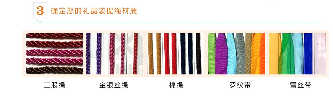常用的手提绳子有三股扭绳,丙纶PP绳,涤纶绳,人字带等。一般应用于礼品包装盒,手提袋。