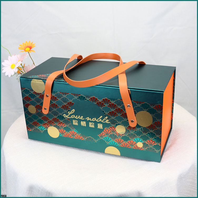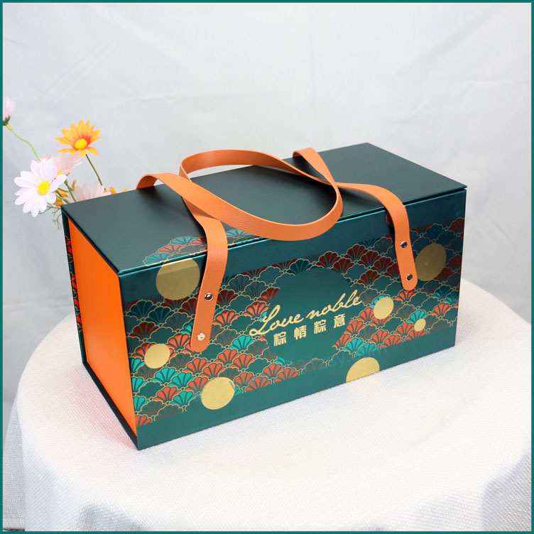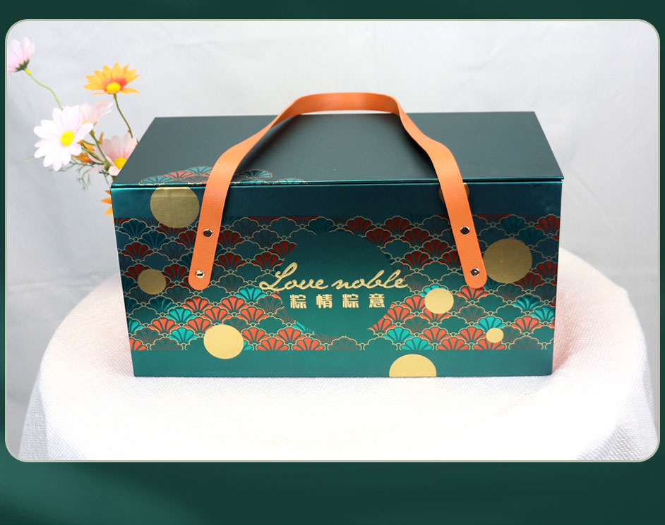 此款粽子礼品包装盒是一款精品礼盒,精选银卡纸裱灰板制作,外盒工艺选用逆向油、局部亮UV、烫金等工艺,配上皮质提手彰显礼盒的精致,长沙包装厂毅丰包装提供免费设计方案/打样修改/送货上门服务,粽子包装盒定制500起做,欢迎来电咨询